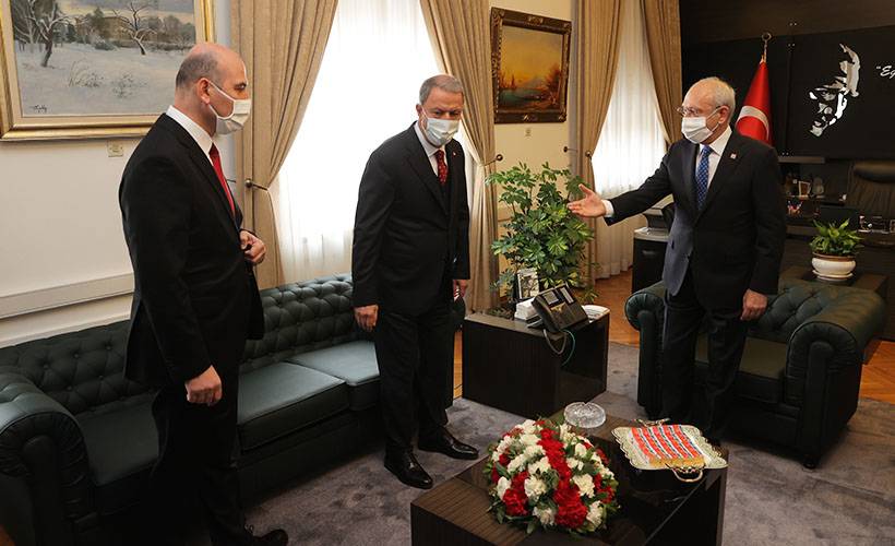 Bakan Akar ile Soylu, Meclis'te önce AKP grubunda Grup Başkanı Naci Bostancı ile görüştükten sonra, CHP Genel Başkanı Kemal Kılıçdaroğlu’nu TBMM'deki makamında ziyaret etti.
