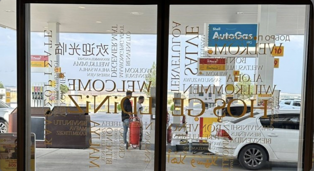 Genel merkezi Hollanda'da bulunan, İngiliz-Hollanda ortaklığındaki Shell’in Türkiye’de binlerce petrol ofisi bulunuyor. Shell, müşteri memnuniyeti için, kapısına İngilizce, Türkçe, Arapça gibi bir çok dilde “hoş geldiniz” yazdı, ancak Kürtçeyi es geçti.
