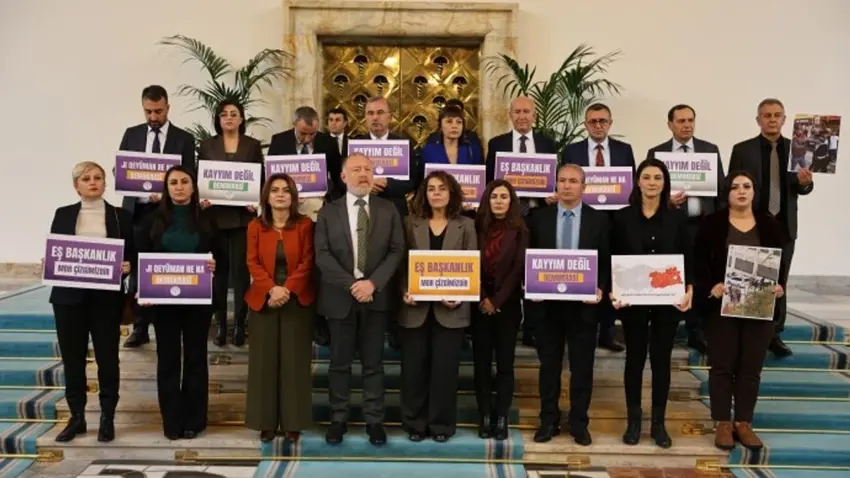 Meclis tarihinde ilk kez Şeref Holü'nde yapılan eylemde “kayyum değil demokrasi” pankartları taşıyan DEM Partililer, "kayyum darbedir, darbelere hayır" sloganı attı.