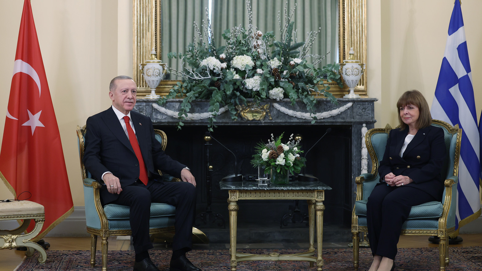Erdoğan, Türkiye-Yunanistan Yüksek Düzeyli İşbirliği Konseyi'nin beşinci toplantısı kapsamında resmi ziyarette bulunduğu Yunanistan'da, Cumhurbaşkanı Katerina Sakelaropulu tarafından Cumhurbaşkanlığı Merkezinde resmi törenle karşılandı.