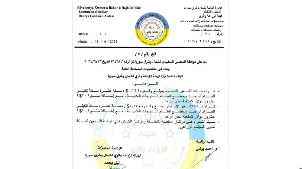 PeyamaKurd - Desteya Çandinî û Avdanê ya Rêveberiya Xweser a li Rojavayê Kurdistanê piştî protesto û nerazîbûnên cotkaran bihayê kirîna ceh ji nû ve diyar kir.