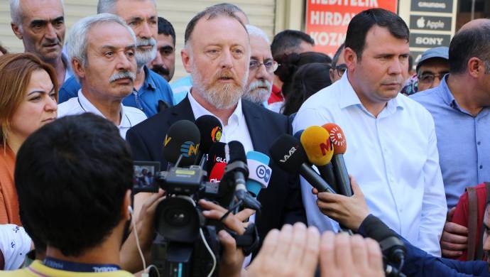 Hevserokê Giştî yê HDPê Sezaî Temellî ku li Diyarbekirê bû, dema nehiştina daxuyaniya çapemeniyê li kuçeyeke Diyarbekirê daxuyanî dan rojnamevanan.