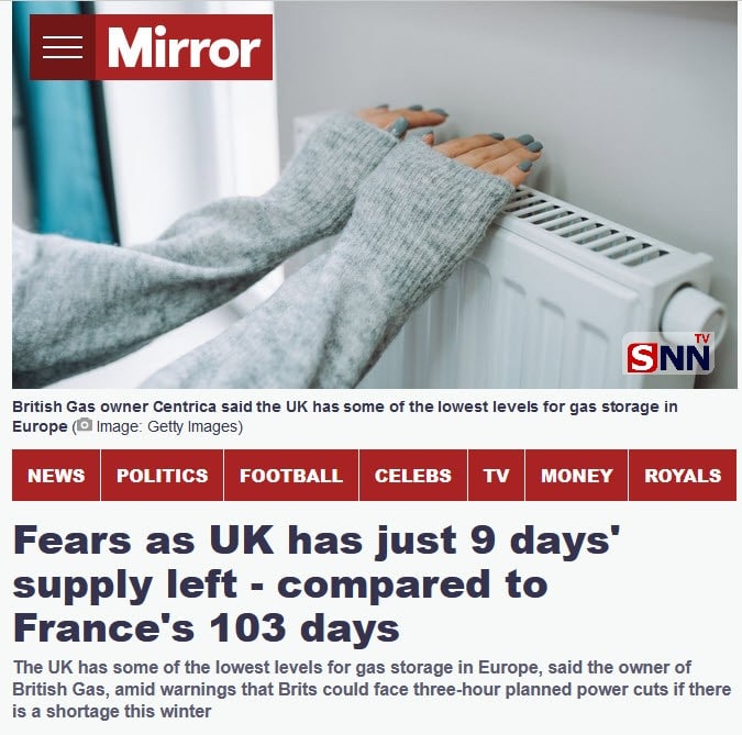 بەڕێوبەری کۆمپانیای گازی بەریتانیا ڕایگەیاند : زەخیرەکانی گاز لە بەریتانیا بۆ ئێستا تەنیا بۆ بەکارهێنانی ٩ ڕۆژی دیکەیە .