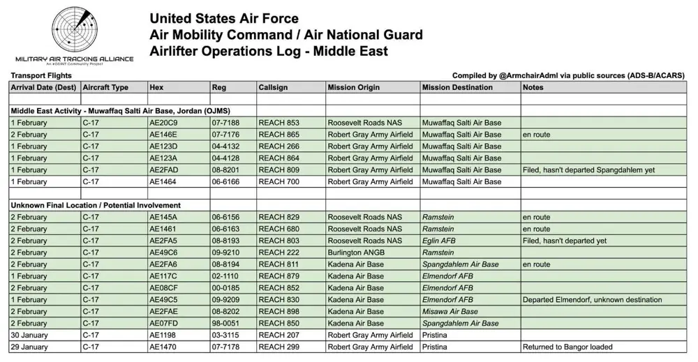 🔻هەروەها 5 فڕۆکەی تری گواستنەوەی جۆری C-17 لە بنکەی هێزی ئاسمانی ڕۆبێرت گرایەوە گەیشتوونەتە بنکەی ئاسمانی شەهید مەوفەق ئەلسووڵتی ئوردن. جگە لەوەش، چەندین گەشت لە بنکەی هێزی ئاسمانی ڕۆزڤێڵت ڕۆدزەوە بۆ ئوردن بیندراون، کە لەوانەیە شەش فڕۆکەی جەنگی ئێف-٣٥ئەی هەڵبگرن.
