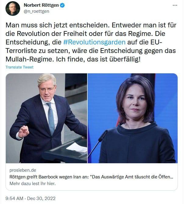 نۆربێرت ڕووتگێن نوێنەری پەرلمانی ئاڵمانیا له توییتێکدا ڕوو له ئانالێنا بێربوک، وەزیری دەرەوەی ئاڵمانیا ووتی: : ئێستا دەبێت بڕیار بدەن که لایەنگری شۆڕشی ئازادیین یا کۆماری ئیسلامی؟!