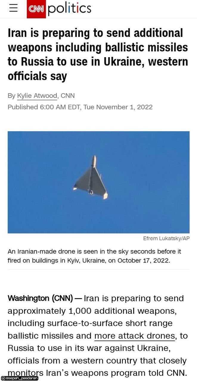 سی ئێن ئێن ڕایگەیاند : ئێران لە حاڵی ئامادەبوون بۆ هەناردەکردنی نزیکەی هەزار چەکی زیادە بۆ فێدڕاسیۆنی ڕووسیا لەوانەش مووشەکگەلی بالێستیکی کورت مەودای زەوین بە زەوین و فڕۆکەگەڵی بێفڕۆکەوانی هێرش بەری خۆکوژی زیاتر بۆ کەڵک وەرگرتنی لە شەڕی ئۆکراین ە .