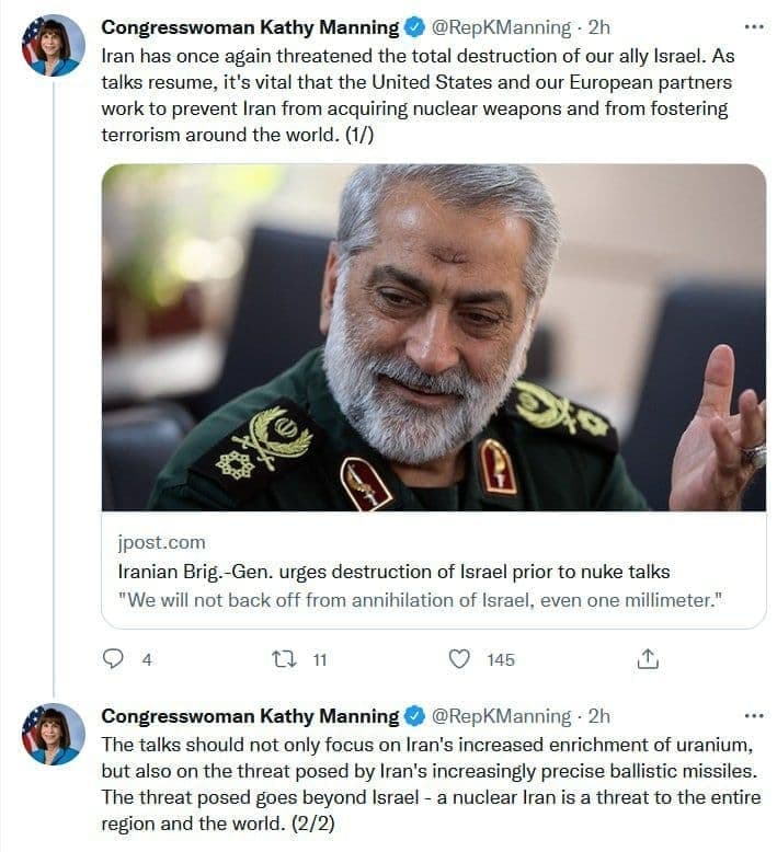 مانینگ نووسیویەتى : کۆمارى ئیسلامى دووبارە هەڕەشەى لەنێوبردنى هاوپەیمانەکەى ئێمە ئیسرائیلى کرد.