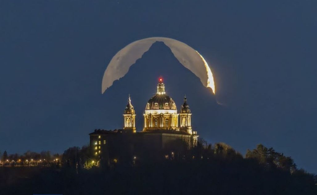 لەم وێنەیەدا مانگ بەسەر قوبەی "کاتدراڵی سوپەرگا" و لووتکەی "مۆنۆڤیسۆ" لە شاری تۆرین لە ئیتاڵیا دانراوە.