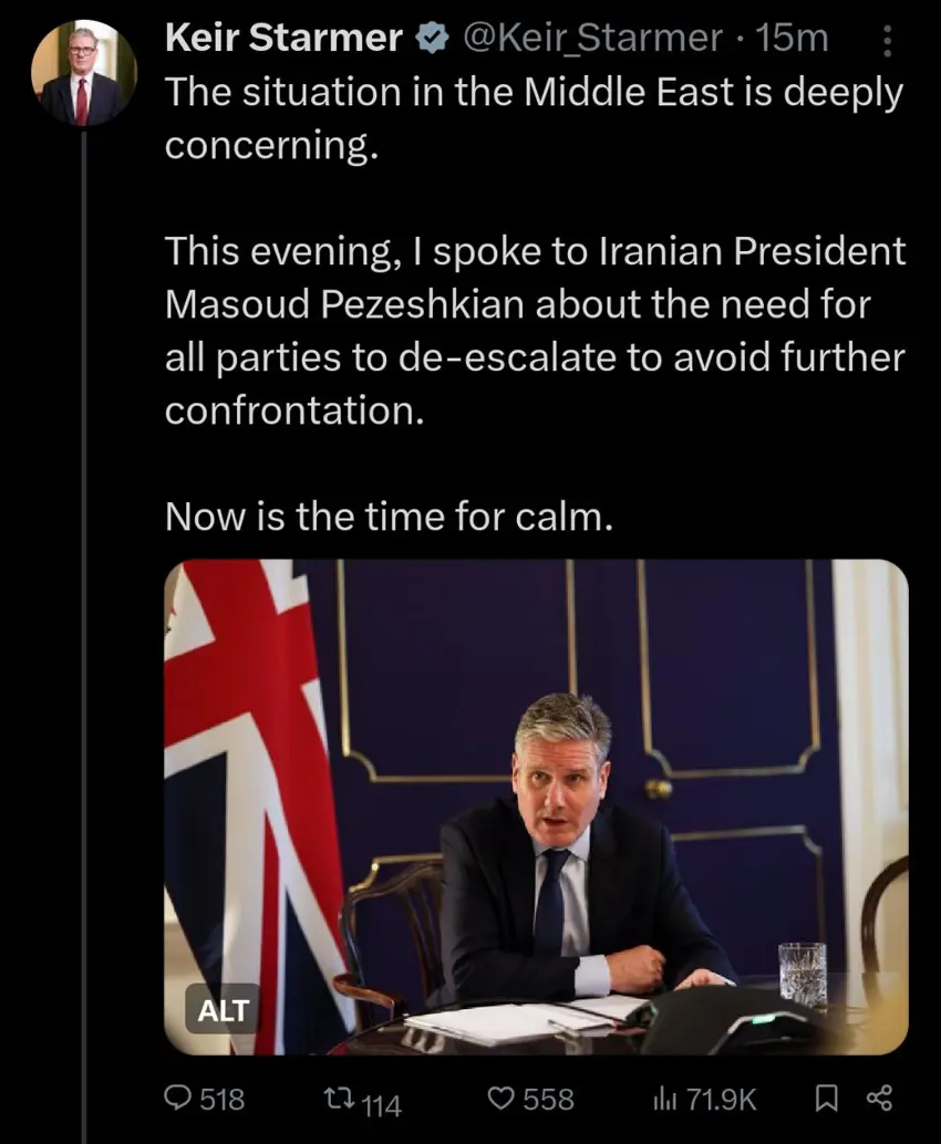 کیەر ستارمەر سەرۆک وەزیرانی بەریتانیا لە پەیامێکدا بۆ مەسعوود پزیشکیان سەرۆک کۆماری ئێران نووسیویەتی : گفتوگۆی بۆنیاتنەر لە نێوان هەردوو ووڵاتدا تەنیا لە حاڵەتێکدا دەتوانرێت بەهێزتر بکرێت کە ئێران "کارە ناسەقامگیرییەکانی خۆی بوەستێنێت"