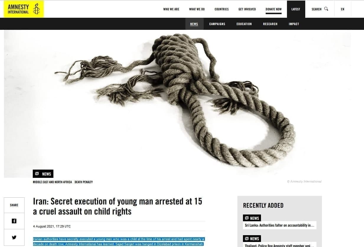 بەگوێڕەی ڕاپۆرتی ڕێکخراوی لێبوردنی نێودەولەتی، بەرەبەیانی ڕۆژی دووشەممە ١١ی گەلاوێژی ٢٧٢١ (٢ی ئاگۆستی ٢٠٢١)، سزای سێدارەی سەجاد سەنجەری، تەمەن ٢٥ ساڵ کە لەکاتی مێرمنداڵی توشی تاوان ببوو، بە نهێنی و بە بێ دوایین چاوپێکەوتن لەگەڵ بنەماڵەکەی لە بەندیخانەی دێزڵئاوای کرماشان سزاکەی جێبەجێ کراوە.