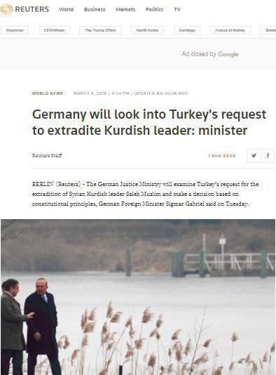 ڕۆیتەرز بڵاوى کردەوە کە زیگمار گابریەلى وەزیرى دەرەوەى ئەڵمانیا، ڕۆژى سێشەممە ڕایگەیاند کە وەزارەتى دادى وڵاتەکەى تاوتوێى داواکارییەکەى وڵاتى تورکیا دەکات کە داوایان کردووە ساڵح موسلیم بدەن بە دەستەوە.